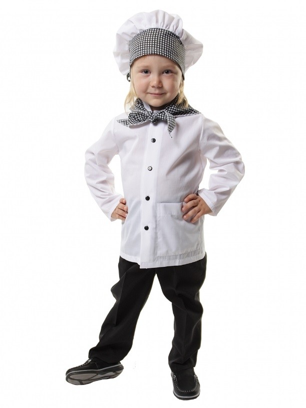 Детский костюм Повара включает в себя белый халат с черными пуговицами и одним боковым карманом, поварской колпак с клетчатой вставкой, а также шейный платок с клетчатым рисунком.