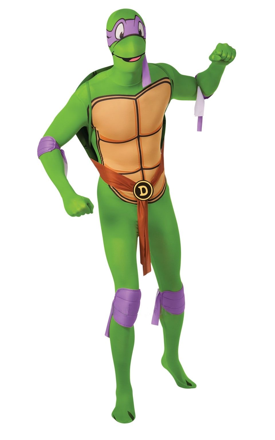 Костюм второй кожи Черепашки Донателло - это яркий зеленый комбинезон, который покрывает все тело с головой. На лице имеется принт мордочки черепашки Доантелло с фиолетовой маской на глазах. Также в комплект входит коричневый пояс к которому крепится панцирь для спины, также панцирь держится за счет удобных резинок на плечи. Образ дополняют налокотники и наколенники.