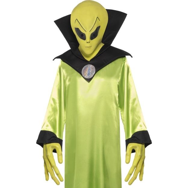 Набор пришельца включает в себя зеленую удлиненную маску с черными большими глазами и длинные зеленые перчатки, выполненные в виде худых кистей рук пришельца.