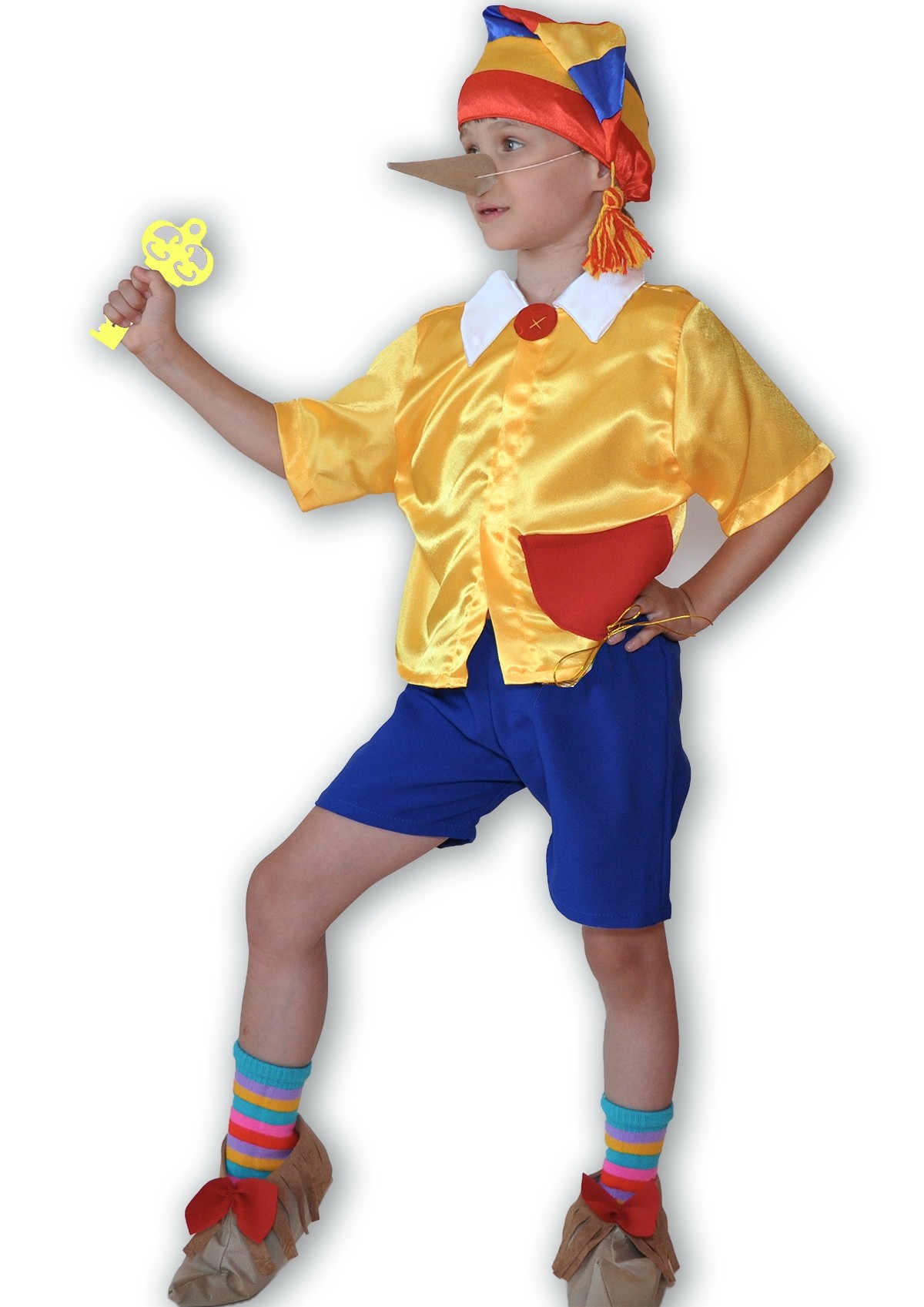 Костюм сказочного Буратино выполнен из атласного материала. В комплекте полосатый колпак с красным отворотом, длинный нос, который крепится при помощи резинки, желтая рубашка с белым воротничком и красным карманом сбоку, шорты синего цвета, а также туфли из мягкого материала.