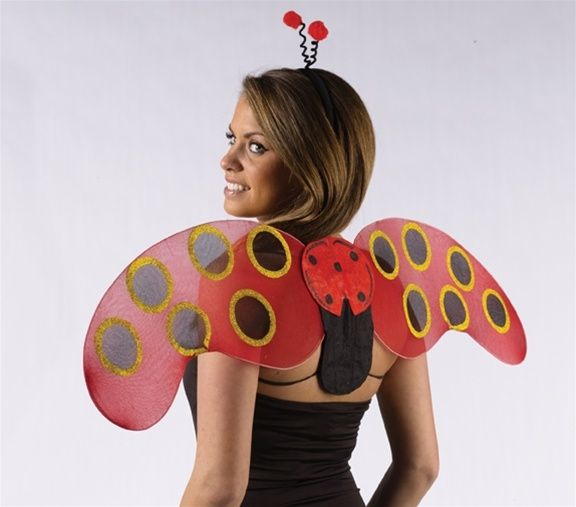 Набор Божья коровка включает в себя крылья из красного сетчатого материала, а также изогнутые рожки на ободке. Крылья украшены крупными черными точками с золотой обводкой. Они крепятся к плечам при помощи черных резинок.