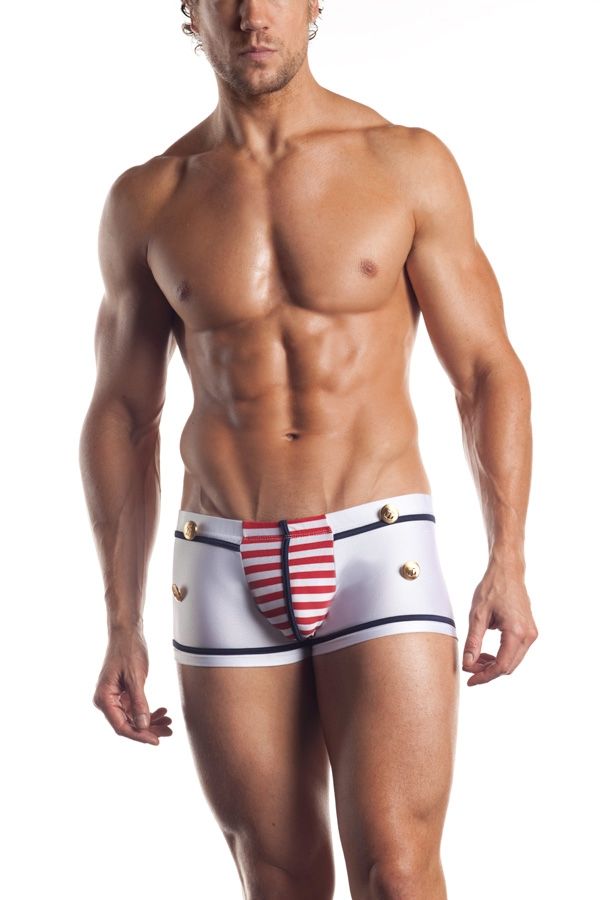 Мужские трусы Моряк - это белые трусы-боксеры с синими полосками. В центре имеется полосатая красно-белая вставка с синим швом. Также трусы украшены золотистыми пуговицами и якорем сзади.
