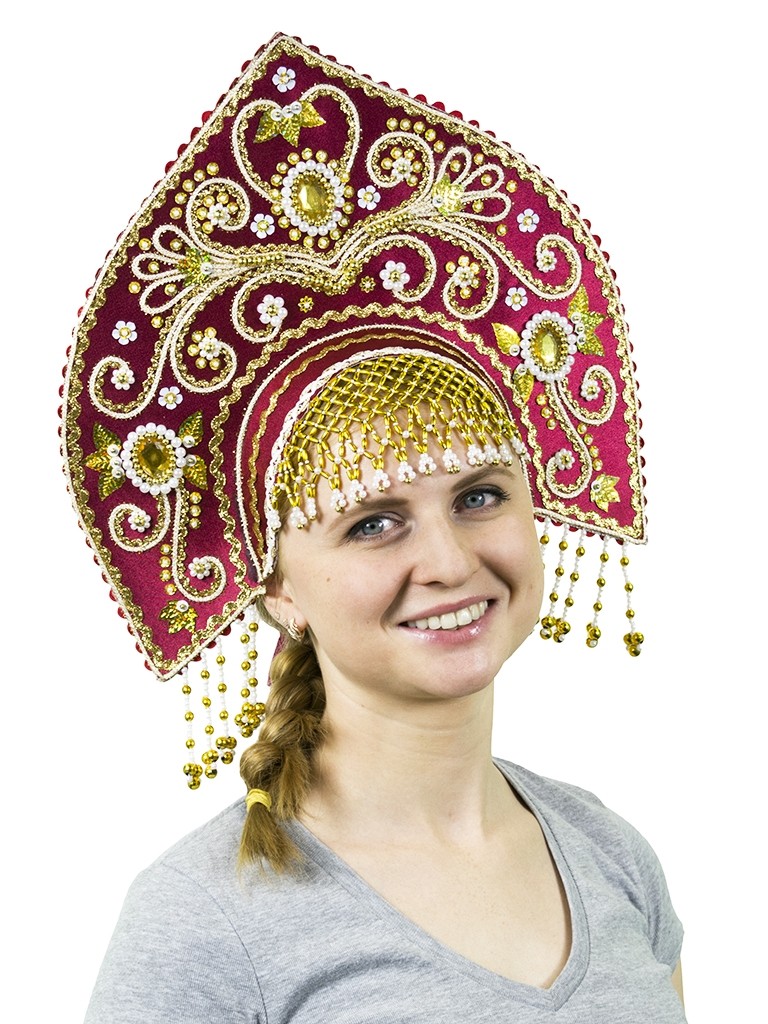 Бордовый кокошник Купола - яркий кокошник из атласного материала бордового цвета, украшенный золотистой аппликацией из тесьмы, пайеток и бусинок.