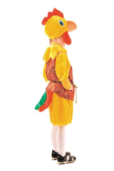 Карнавальный костюм петуха предназначен для мальчишек с яркой индивидуальностью, ведь данный сказочный персонаж отличается своей любовью к позёрству и привлечению всеобщего внимания. А как не обратить на такого красавчика внимание, когда всё на нём приводит окружающих в восторг: и яркий гребень на голове, и клюв, и разноцветный хвост, горделиво оттопыренный петушком. Костюмчик укомплектован объёмными шортиками, кофточкой с длинным рукавом и шапочкой- головой петуха. Материалы, из которых выполнен костюм: шёлк и искусственный мех, цвет жёлто-красный, а также яркие тканевые вкрапления в хвосте.