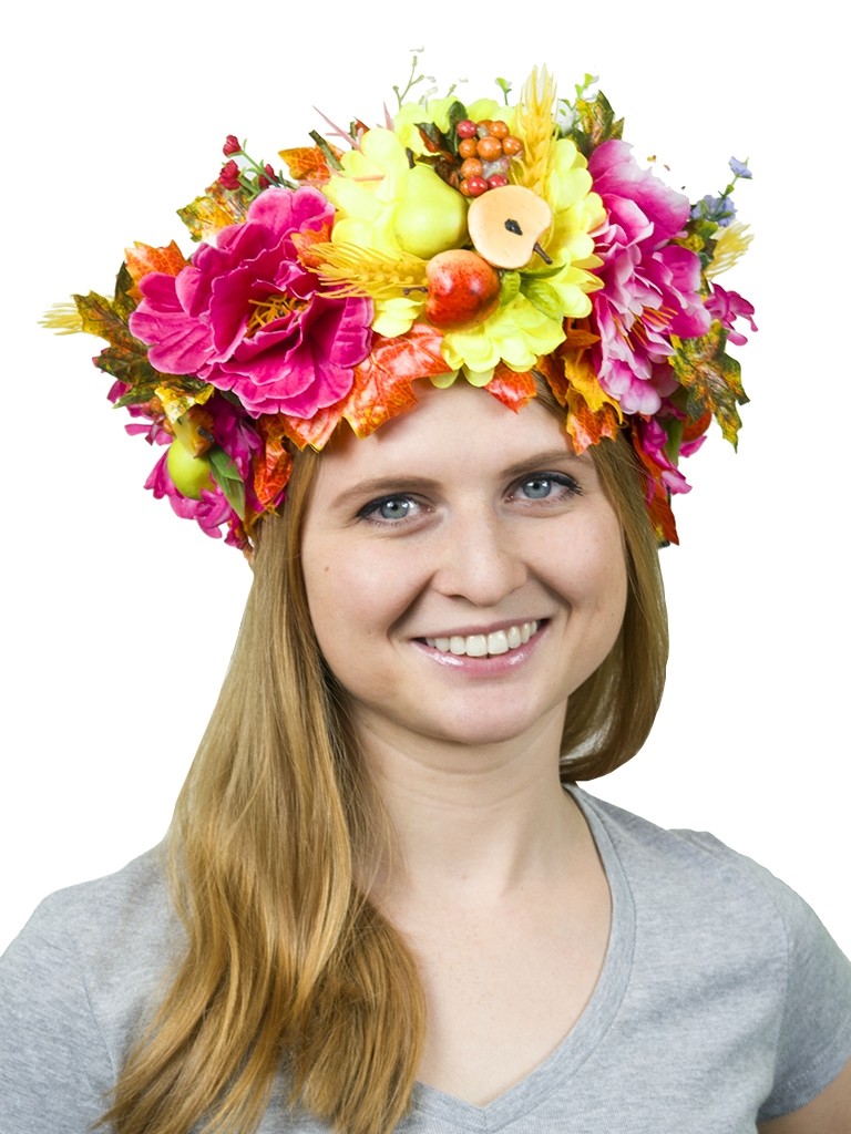 Цветочный венок Осень - яркий венок на мягкой основе, украшенный аппликацией из ярких разноцветных цветов и муляжа фруктов. Идеален для создания русского народного образа.