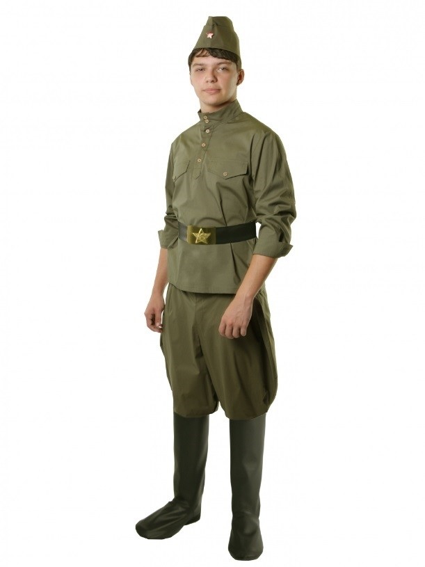 Военный мужской комплект  станет идеальным к празднику - День Победы. В комплект входит гимнастерка из хлопчатобумажного материала с золотистыми пуговицами на вороте и манжетах. Также к ней прилагаются брюки-галифе, черный ремень из кожзаменителя с золотистой пряжкой со звездой и пилотка, которая также дополнена небольшой звездочкой.