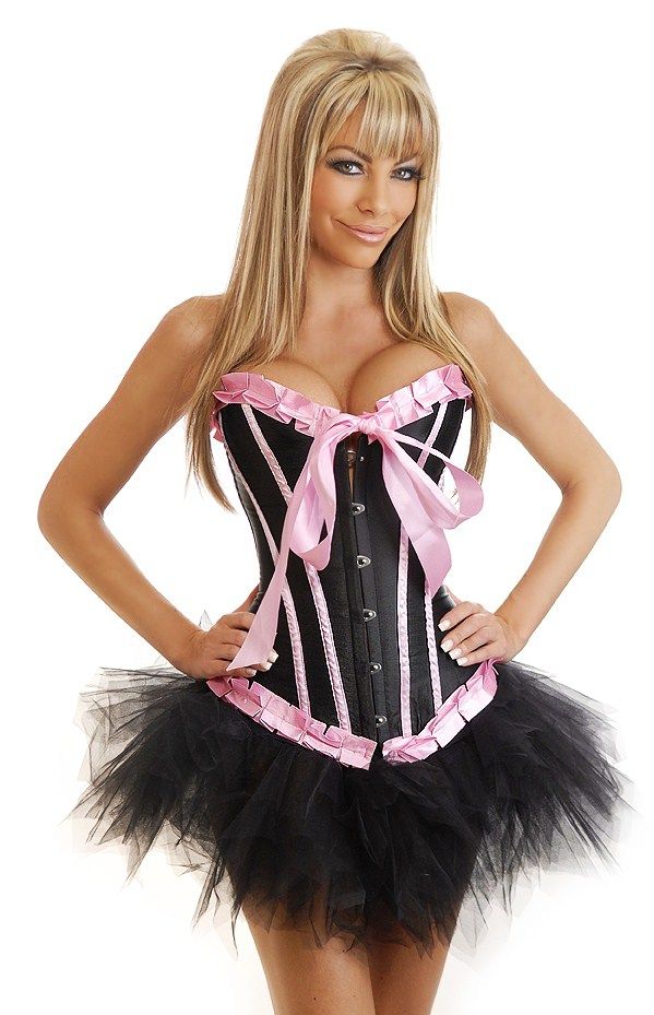 Корсет черно-розовый с юбкой - корсет без бретелек, спереди застегивается на крючки, сзади на шнуровке. В комплект входят стринги. Корсет декорирован розовой атласной лентой.