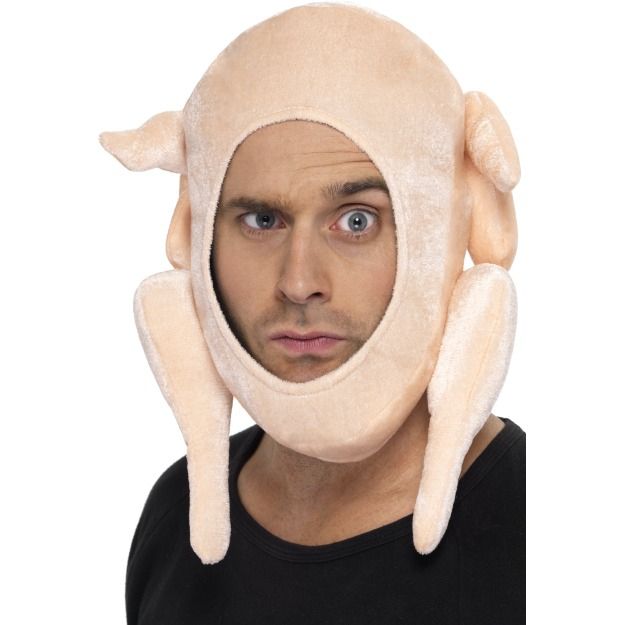 Шляпа Фаршированная Курица представляет собой разделанную курицу без головы, которая одевается на вашу голову. В ней имеется отверстие для вашего лица. Шляпа выполнена в светлом бежевом цвете.