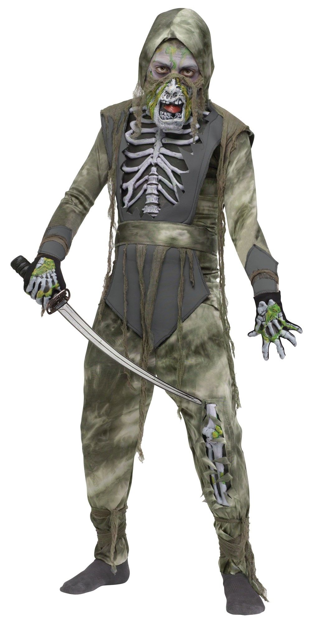 Детский костюм зомби ниндзя - это жуткий костюм, выполненный в зеленых и серых грязных тонах. В костюм входит рубашка с капюшоном, маска на нижнюю часть лица, изображающая жуткую челюсть зомби. Также в комплекте имеется черная туника с накладной открытой грудной клеткой. На брюках, на одной из штанин имеется вставка в виде открытой кости. На широком ремне свисают марлевые повязки. Также имеются перчатки с изображением костей.