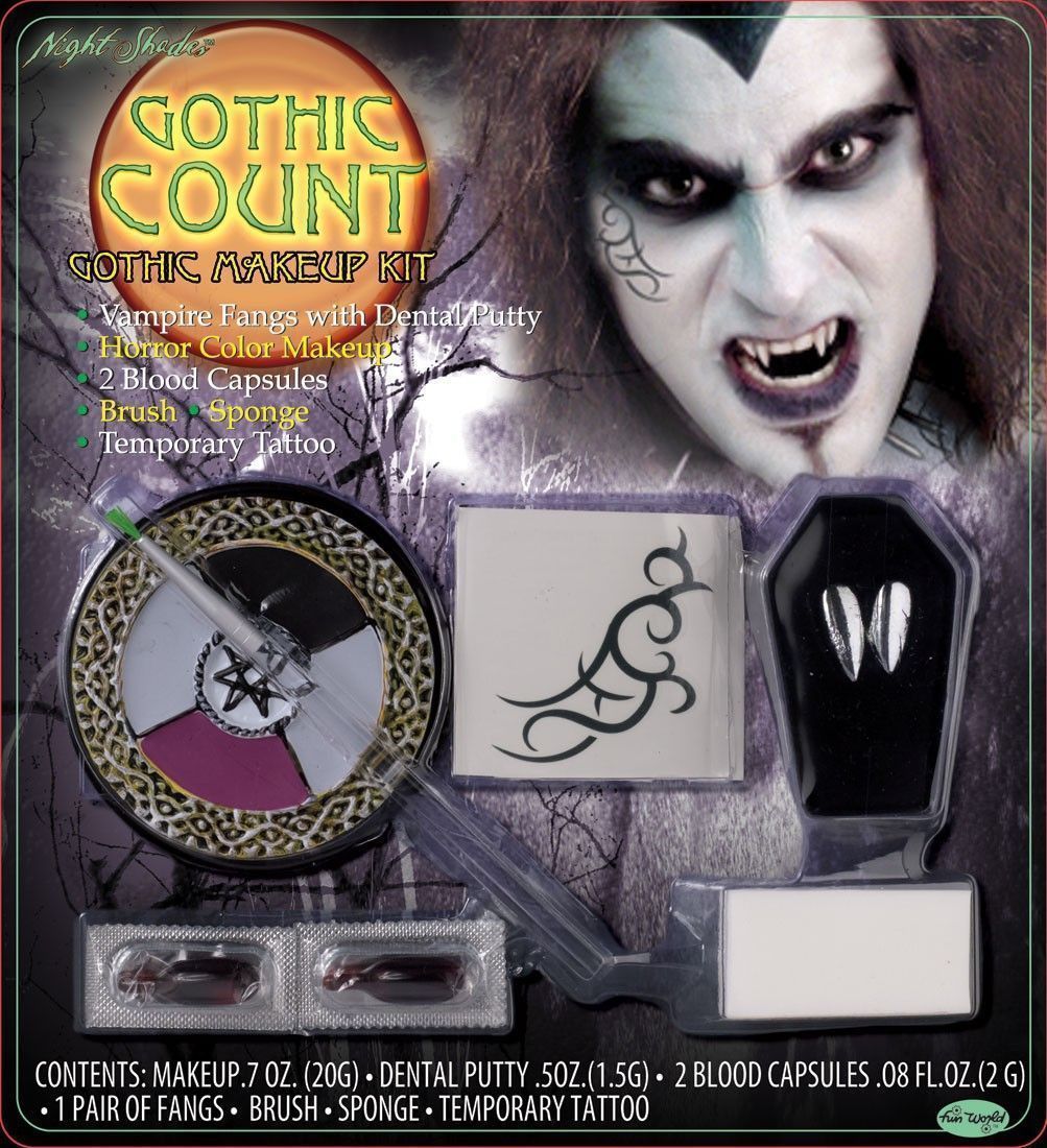 Готический набор Вампира включает в себя накладные клыки, косметику трех цветов, накладную татуировку, две капсулы с искусственной кровью, кисточку и губку. Этот набор идеально подходит для создания готического пугающего образа вампира.