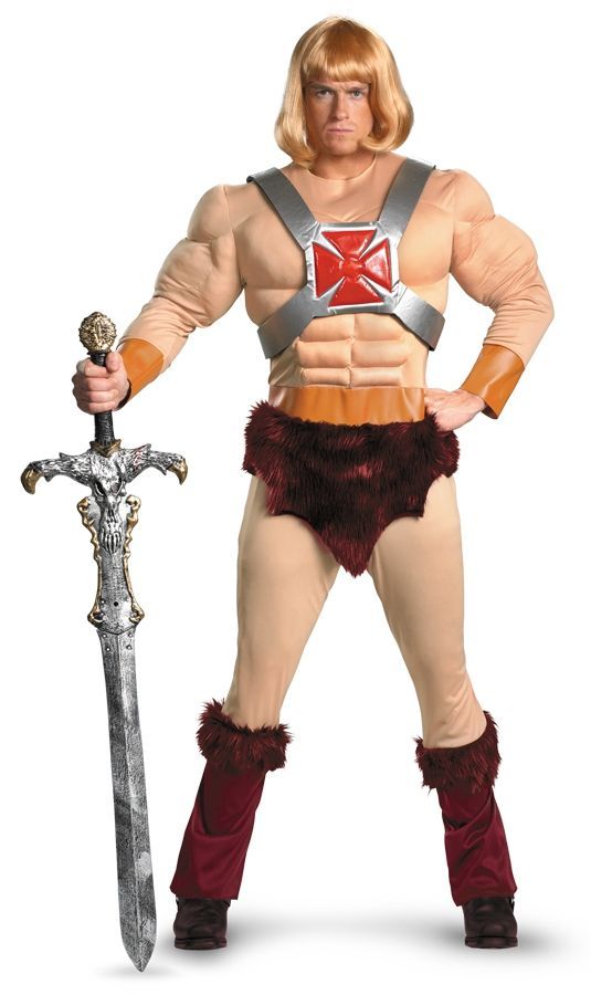 Костюм мускулистого рыцаря включает в себя комбинезон телесного цвета с мускулами, к комбинезону прикреплён искусственный мех, на груди имеется красный крест, также к костюму прилагается парик. Меч в комплект не входит, но его можно приобрести отдельно. Такой костюм сделает из вас сильного и отважного рыцаря.