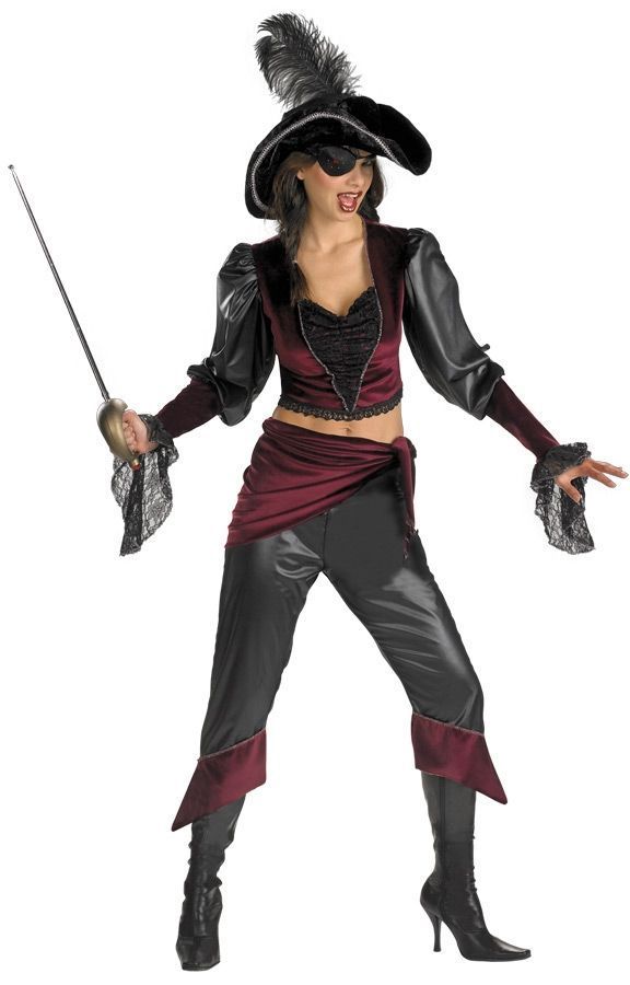 Костюм отважной пиракти-красотки включает в себя: короткую кофточку с длинными рукавами, брюки с бордовой повязкой на бедра, шляпу с пером и повязку на глаза. В таком наряде вы плените капитана любого судна. Для завершения образа предлагаем приобрести у нас на сайте пиратский меч.