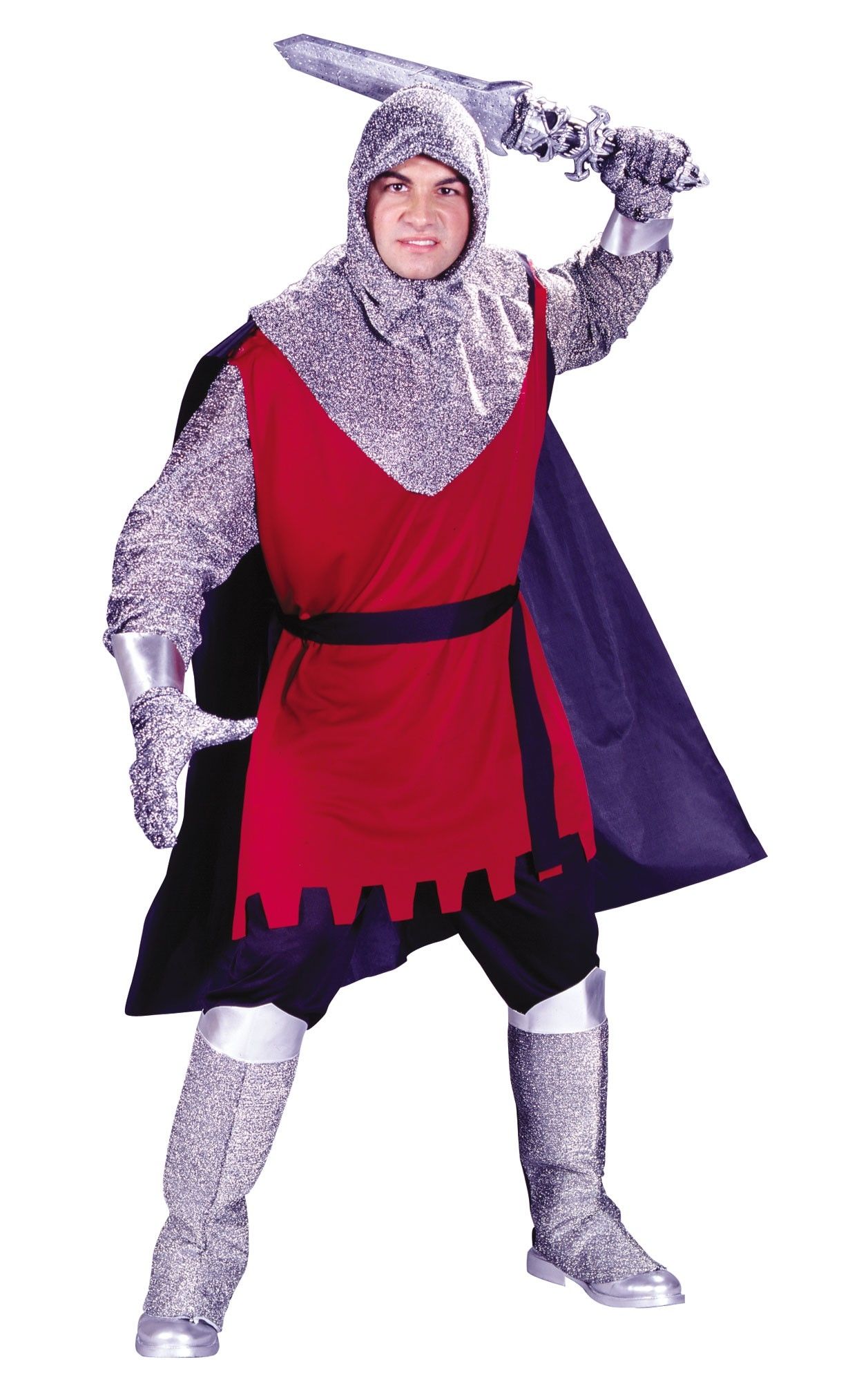 Кольчужный костюм средневекового рыцаря - включает в себя серебряную рубашку, капюшон, перчатки и накладки на сапоги, которые выполнены в виде кольчуги. Также в костюме имеется длинная красная туника с синим плащом и темно-синие брюки. Меч в комплект не входит.