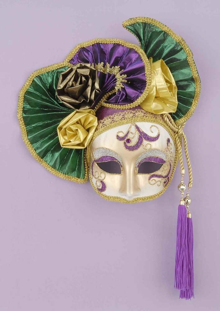 Венецианская маска с гофрой - это маска на глаза, выполненная в телесном цвете и украшенная фиолетовыми и золотыми узорами. Сверху маска украшена разноцветным гофрированным материалом, а также объемными цветами. Сбоку свисают золотые бусинки с фиолетовыми кисточками.