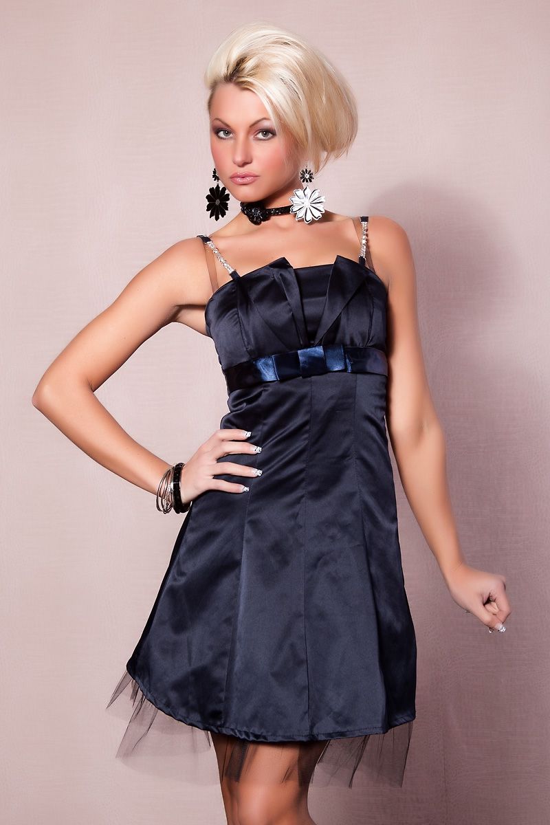 Платье с серебряными бретельками синее - это атласное платье, украшенное бантиком на поясе. Юбка платья слегка расклешенная. Подол платья сделан из сетчатого легкого материала. Сзади имеется скрытая молния.