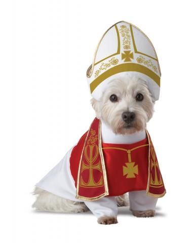 Костюм Папы Римского для собаки включает в себя накидку, выполненную в красно-белом цвете с золотистой отделкой, а также белый головной убор с золотистой отделкой.