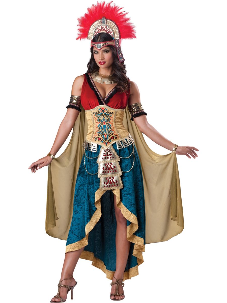 Костюм королевы майа - это шикарное платье с прикреплённой накидкой, корсет вышитый узорами, манжеты, ожерелье и шикарный головной убор с красными перьями. В этом костюме преобладает золотой цвет, что говорит о величии и богатстве королевы майа. Подобрав соответствующий парик вы завершите это прелестный образ королевы майа.
