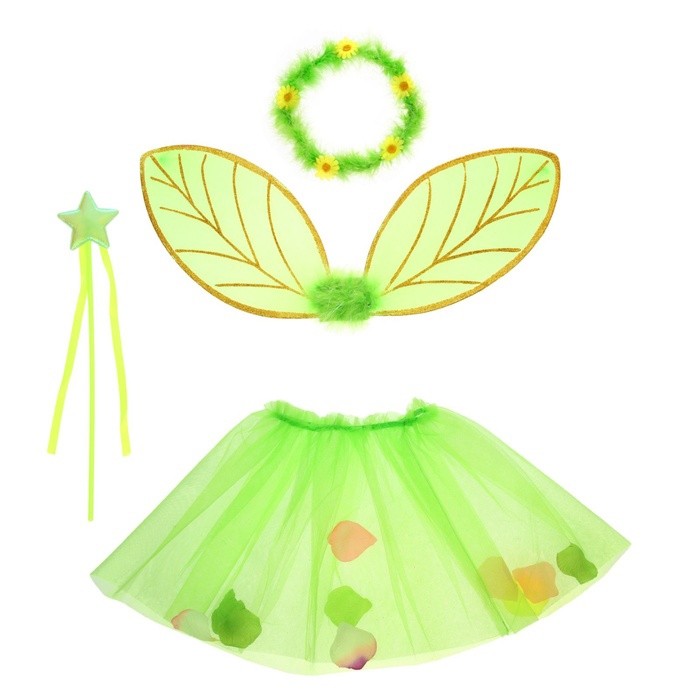Детский набор лесной феи поможет создать Вашему ребенку яркий образ на детском празднике. Набор включает в себя пышную зеленую юбочку, полупрозрачные крылышки в виде листочков с золотистым узором, венок на голову с желтыми цветочками и волшебную палочку с ленточками и звездой.