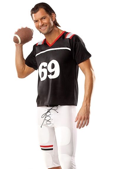Костюм футболиста непременно понравится мужчинам, которые увлекаются футболом и подобными видами спорта. В комплекте костюма имеется футболка, наплечники и белые бриджи со шнуровкой и чёрным ремнём. Этот костюм можно надеть на футбол и другие игры.