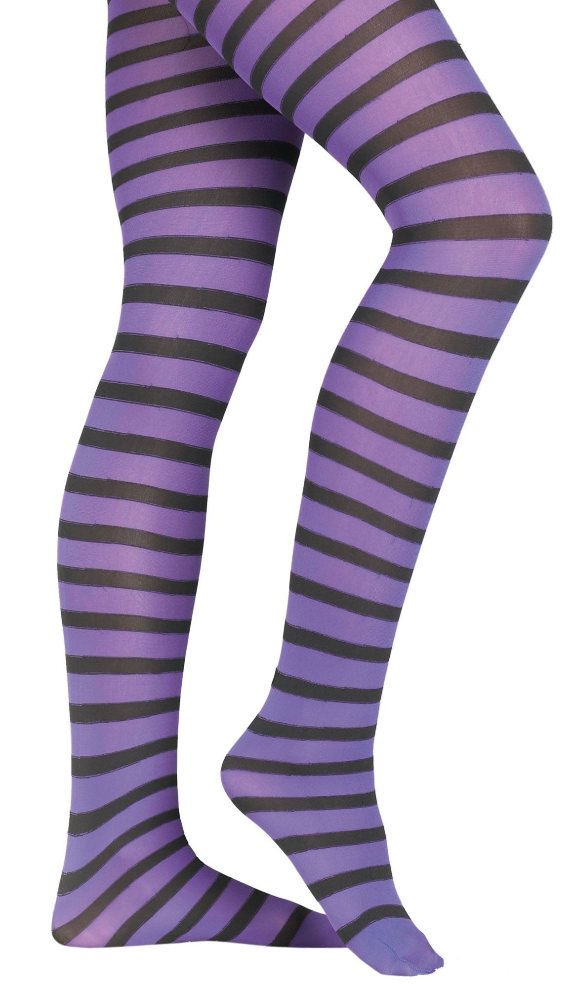 Колготки фиолетовые в черную полоску - это эластичные колготки для взрослых, которые выполнены в фиолетовом цвете с черными горизонтальными полосками. Такие колготки могут стать хорошим дополнение к костюму ведьмочки.