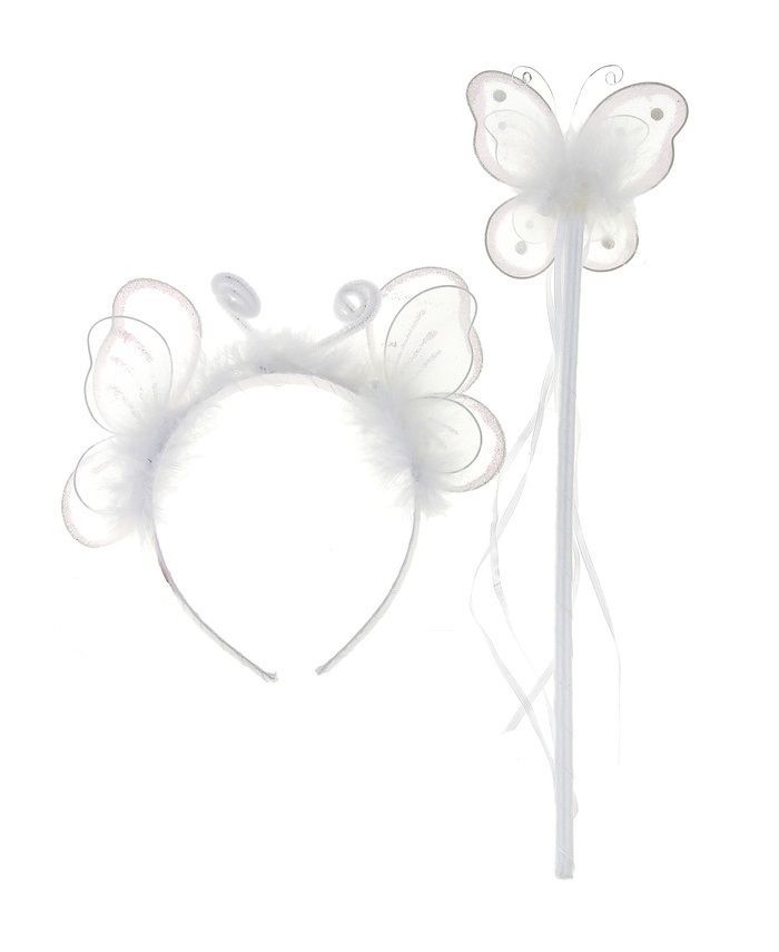 Набор маленькой волшебницы белого цвета включает в себя ободок с крылышками бабочки и усиками и волшебную палочку с бабочкой на наконечнике. Набор станет отличным вариантом для проведения детских праздников и прекрасно дополнит карнавальные костюмы.