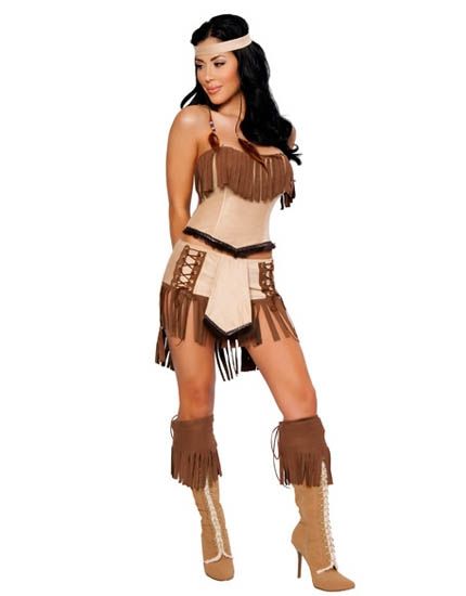 Костюм принцессы племени чероки. Костюм включает в себя коричневый топ бюстье с бахромой на шнуровке сзади, соответствующую мини-юбку с двойной шнуровкой спереди, повязку на голову с пером, накладки на сапоги с бахромой, стринги.