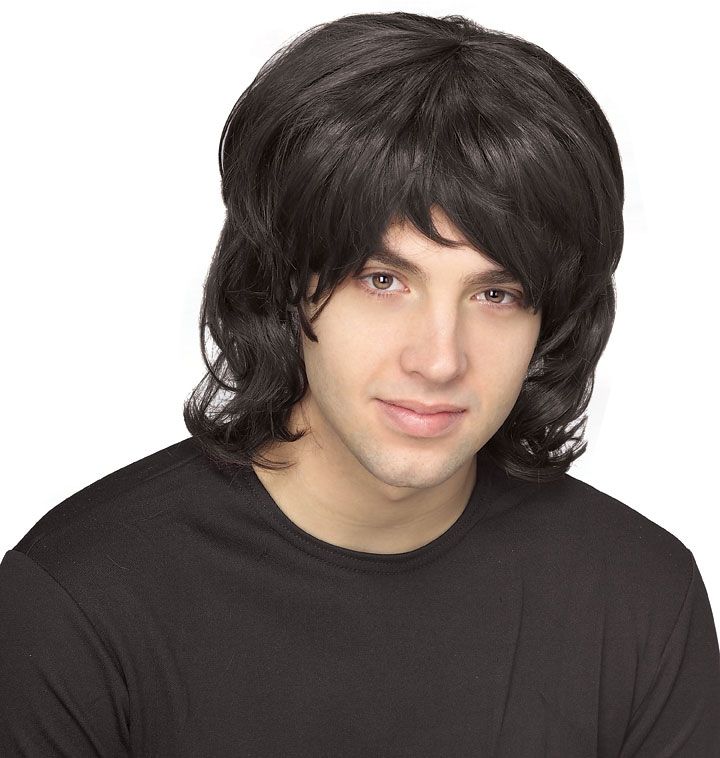 Черный мужской парик 70-х выполнен из синтетических волос черного цвета. Слегка вьющиеся волосы до плеч.