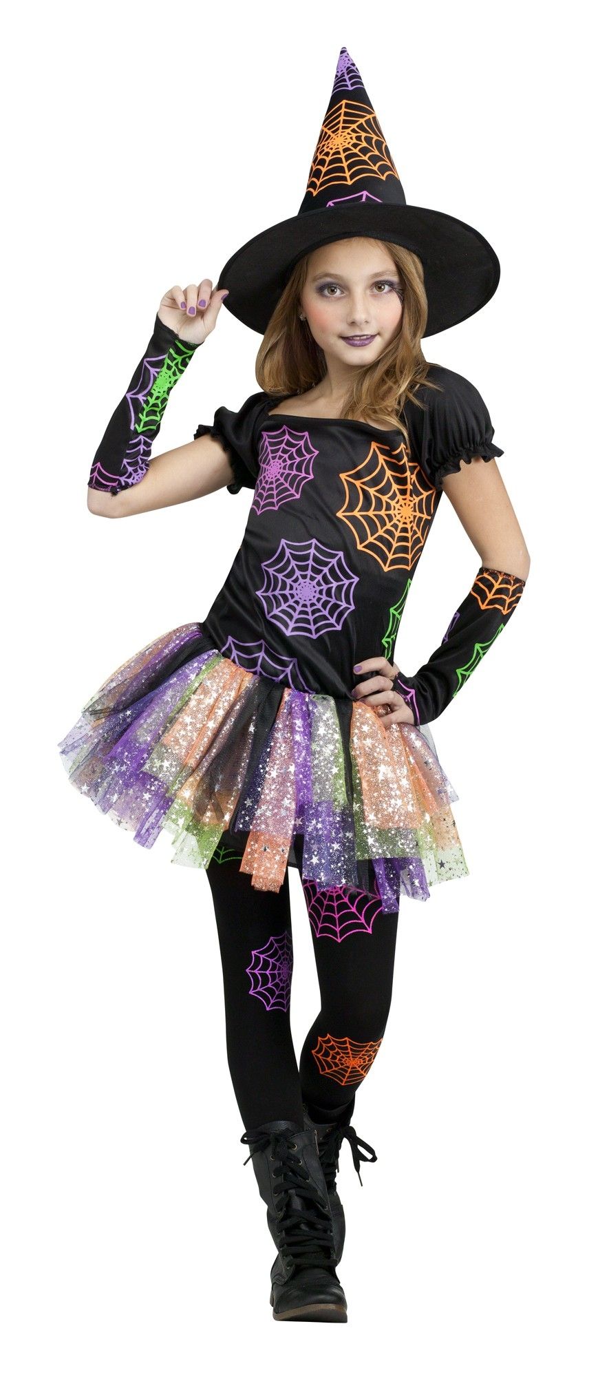 Детский костюм Дикой ведьмочки включает в себя черное платьице с цветной пышной юбочкой, украшенной блестками. Топ платья украшен цветными паутинками. Также в комплект входит конусная шляпка, перчатки без пальцев и черные лосины, которые также украшены цветными паутинками.