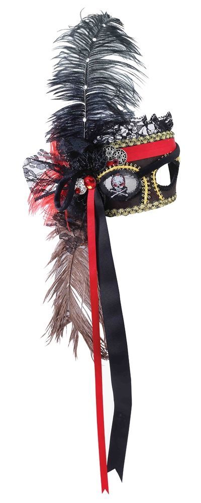 Пиратская венецианская маска - это маска на глаза, выполненная в красно-черном цвете и украшенная золотой тесьмой. Одну прорезь для глаза закрывает повязка с изображением черепа и костей. Сбоку маска украшена большим пером и свисающими лентами.