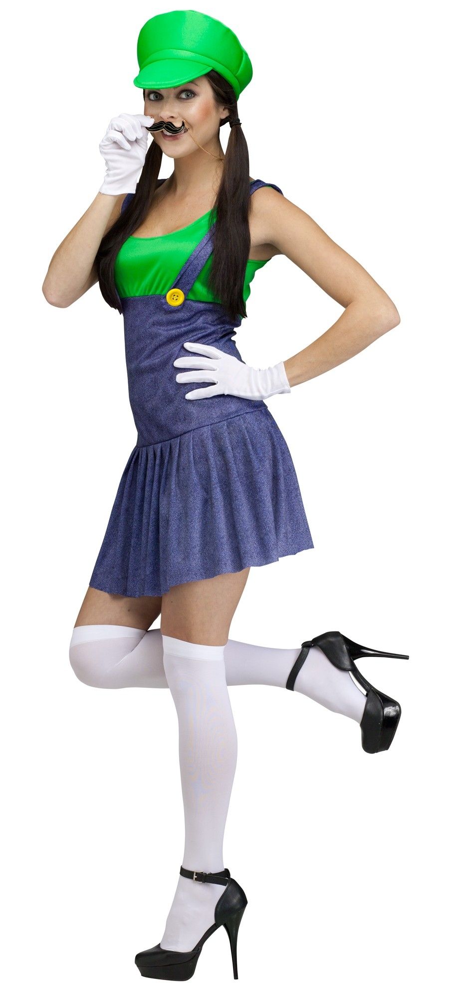 Женский костюм Луиджи состоит из синего легкого платья с зеленым топом. Платье имитирует сарфан с топом. Также в комплект входит яркая зеленая кепка и цепочка на шею с металлическим усами.