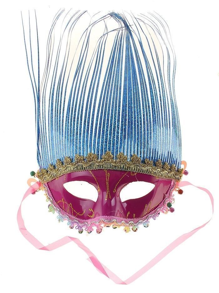 Карнавальная маска нимфы фиолетового цвета и синими волосами, золотистой отделкой сверху и разноцветными бусинками снизу. Размер маски 20х36 см.
