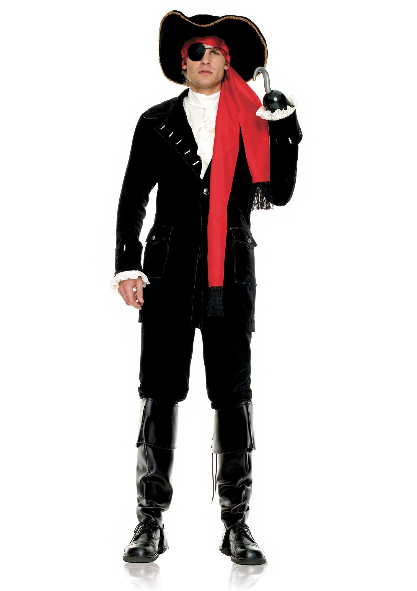 Костюм состоит из 7 частей: шляпа пирата, глазная повязка, бандана, пиджак с белыми манжетами на рукавах, рубашка, пластиковый крюк пирата, штаны.