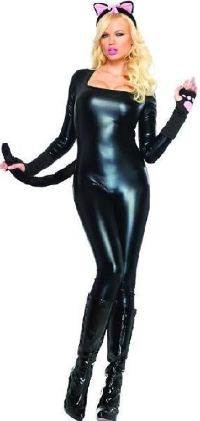Костюм гламурной женщины-кошки состоит из комбинезона. Отличный вариант для тематической вечеринки любителей комиксов.