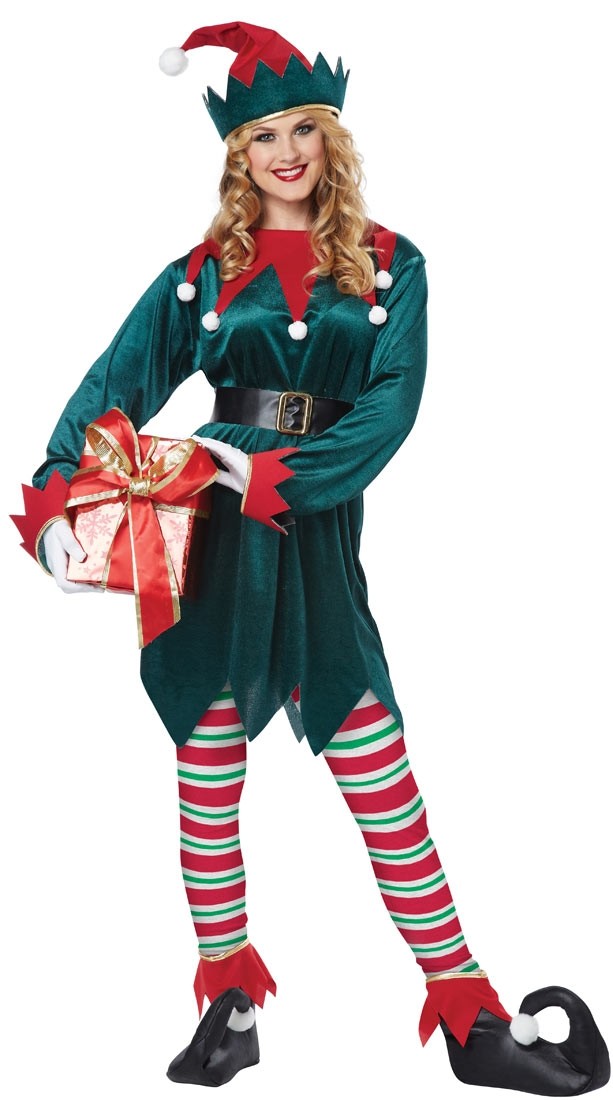 Костюм веселого Рождественского Эльфа включает в себя зеленую тунику с красным воротником и манжетами, колпак с помпоном, черный ремень с пряжкой, полосатые колготки и бахилы на обувь с закругленными носами.