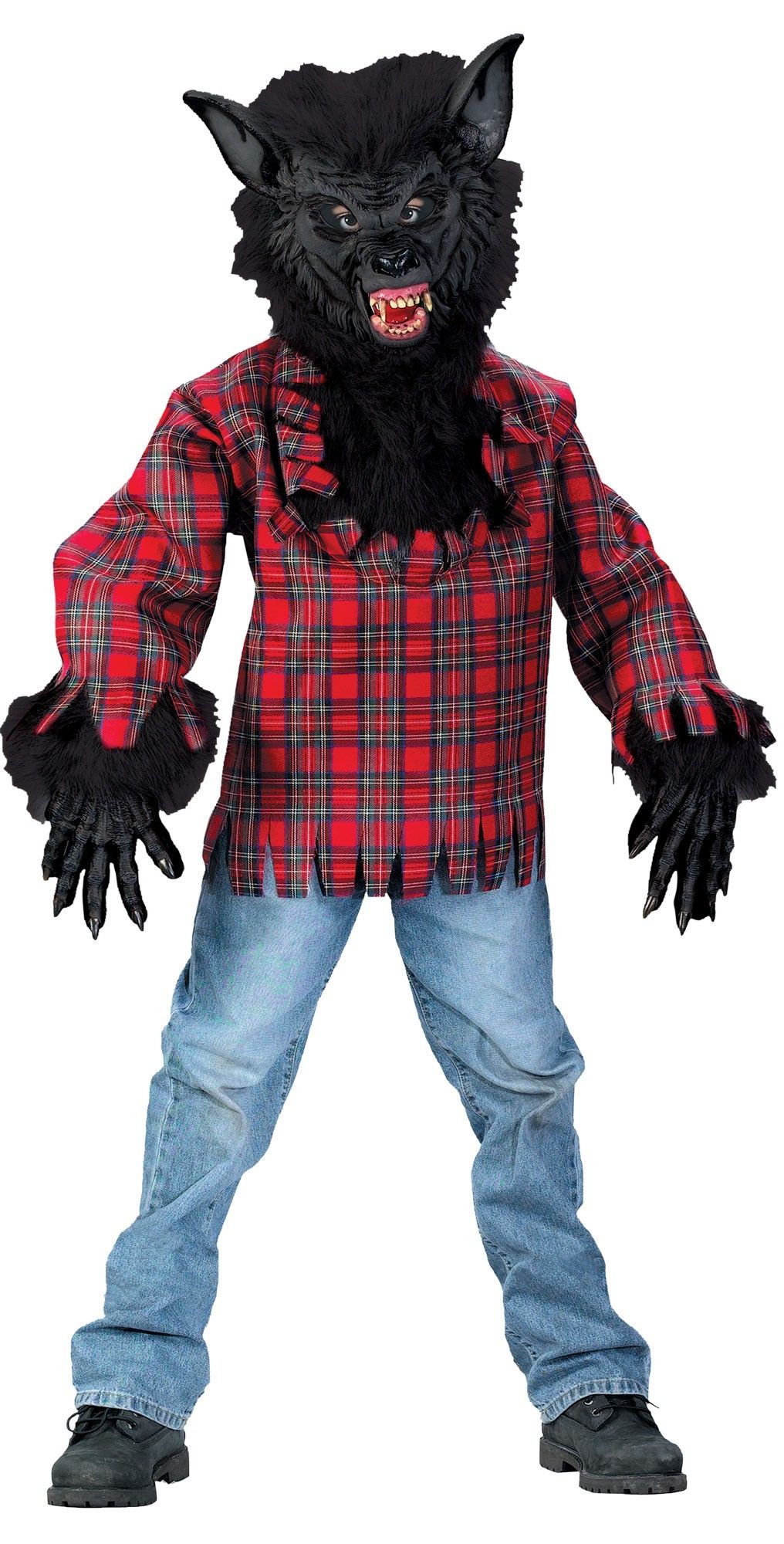 Костюм подростка волка включает в себя красную клетчатую рубашку, меховые черные перчатки с латексными акцентами, а также черную маску волка, выполненную из меха и латекса.