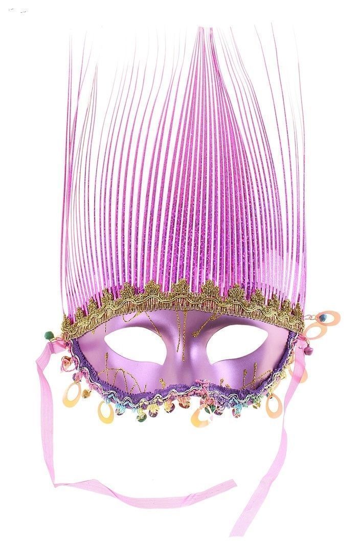 Карнавальная маска нимфы сиреневого цвета с золотистой отделкой сверху и разноцветными бусинками снизу.