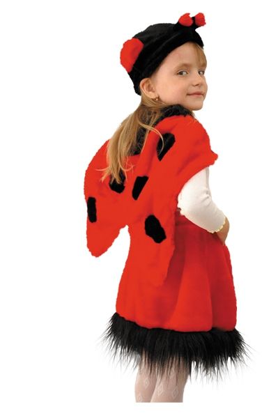 Этот забавный костюм красной божьей коровки понравится всем озорным девочкам. Красная накидка в чёрный горох, юбочка с чёрной опушкой и шапочка с рожками - всё это и составляет костюм красной божьей коровки. Он очень легко одевается и ваша малышка сможет надеть его сама.
