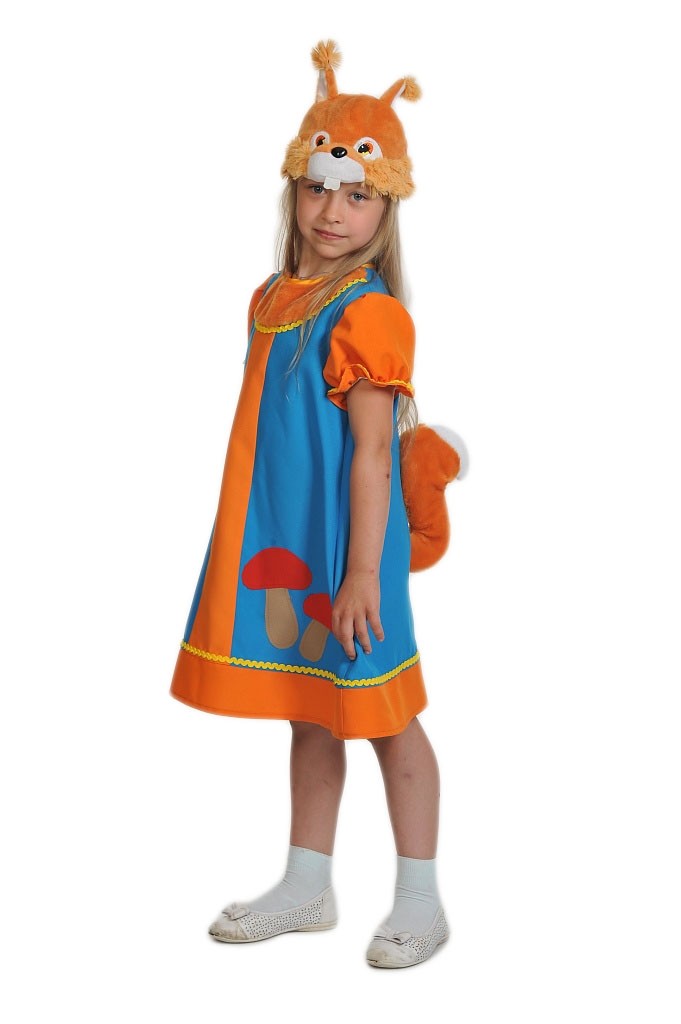 Детский сказочный костюм Белочки - яркий костюм, который включает в себя длинный сарафан голубого цвета с оранжевыми вставками и рукавами, также к нему пришит оранжевый хвост. Образ дополняет шапочка-маска в виде мордочки белочки.