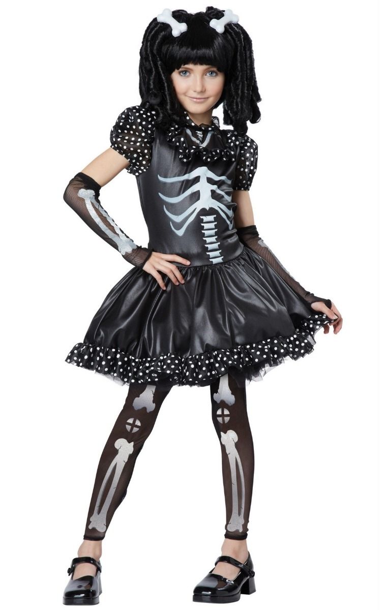 Костюм подруги скелета специально создан для того, чтобы можно было более ярче передать столь легендарный и мистичный образ. На любом тематическом празднике сделает Вашего ребенка центром всеобщего внимания. Состоит из платья с анатомическим принтом костей и с таким же дизайном леггинсы, нарукавники и две заколки в виде косточек.