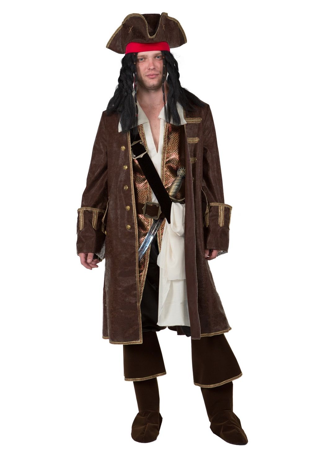 Классический костюм Джека Воробья самого популярного пирата карибских островов. В комплекте: рубаха с жилетом, брюки с накладками, камзол, бандана, треуголка, пояс-2 шт., пояс, сабля,парик.
