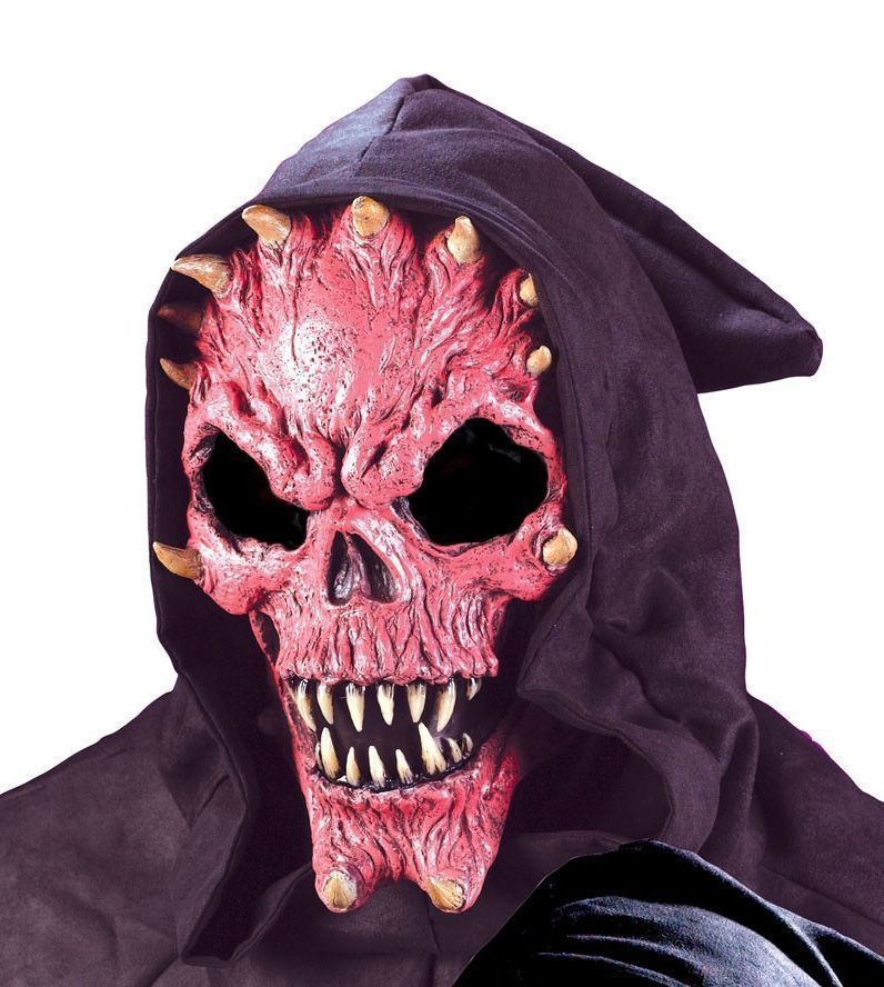 Маска красного Черепа-Демона - это жуткая маска, которая подойдёт для Хэллоуина. Маска выполнена в красном цвете, к ней прикреплен капюшон. У черепа имеются острые зубы, большие чёрные пустые глазницы, из черепа торчат небольшие но острые рожки светло-желтого цвета. Большие сетчатые вырезы для глаз очень удобны.