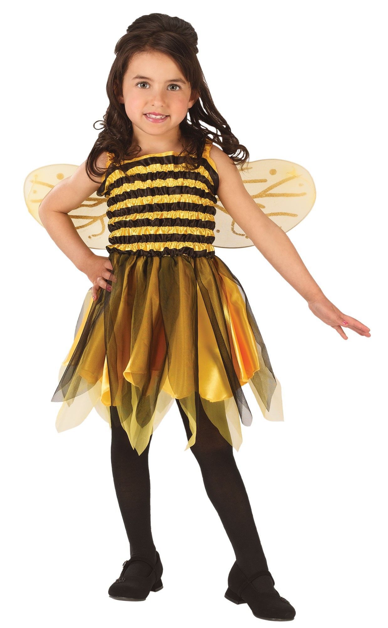 Костюм веселой пчелки состоит из платья, выполненного в желто-черном цвете. Верх платья полосатый, а юбка из легкого разлетающегося материала, также к платью прилагаются полупрозрачные желтые крылья с узорами. Такой костюм можно дополнить гримом, гетрами и сумочкой.