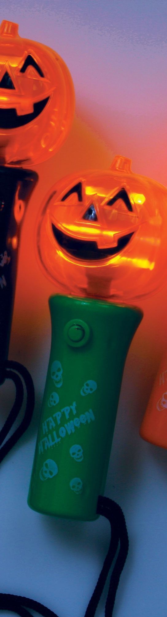 Фонарик Мини-тыква зеленый - прекрасный аксессуар для вечеринки в честь Хэллоуина. Ручка фонарика выполнена в зеленом цвете, на ней имеется белая надпись: Happy Halloween, а также изображения черепков. Сверху на ручке оранжевая тыква с забавной мордочкой. Поставляется с тремя батарейками AG13.