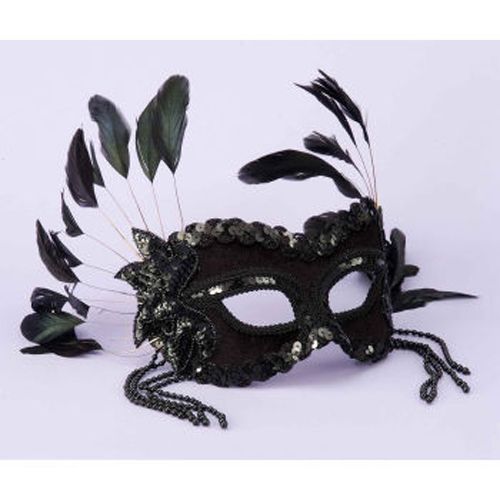 Черная карнавальная маска украшена черными блестящими пайетками, а также высокими черными перьями и свисающими черными бусинами. Эта маска идеальна для черных пышных платьев.