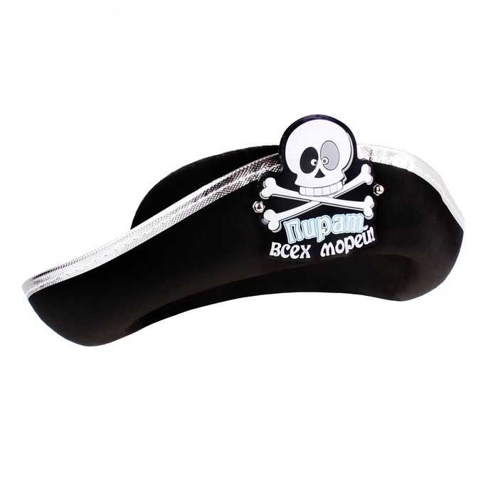 Веселая пиратская шляпа - это черная шляпа с серебряной каймой, украшенная забавным черепком и надписью "Пират всех морей".