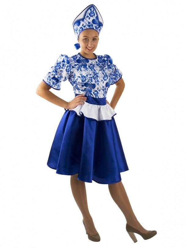 Женский костюм Гжель включает в себя изящное платье с длинной атласной юбкой синего цвета с белой баской и узорчатым топом в стиле гжель. Также к платью прилагается сине-белый кокошник, который также украшен узорами в стиле гжель.