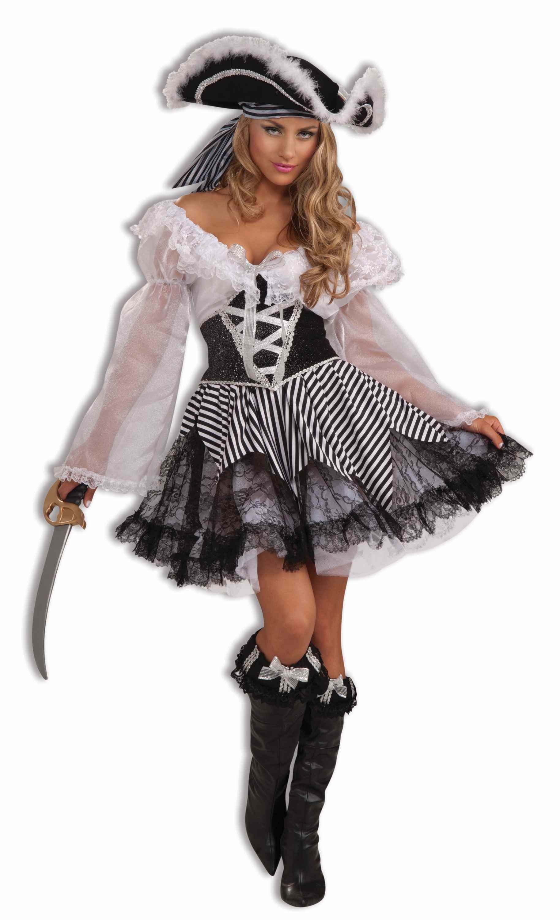 Костюм соблазнительной пиратки - это роскошное черно-белое платье с пышной юбкой, сексуально открытыми плечами, прозрачными рукавами и широким поясом в виде корсета. В комплекте также идут накладки на обувь. Такая красотка способна свести с ума любого мужчину, который под властью чар отдаст не только все сокровища, но и свое сердце. Костюм соблазнительной пиратки можно надеть на тематическую вечеринку или корпоратив. Вы также можете подобрать себе различные аксессуары к костюму на нашем сайте.