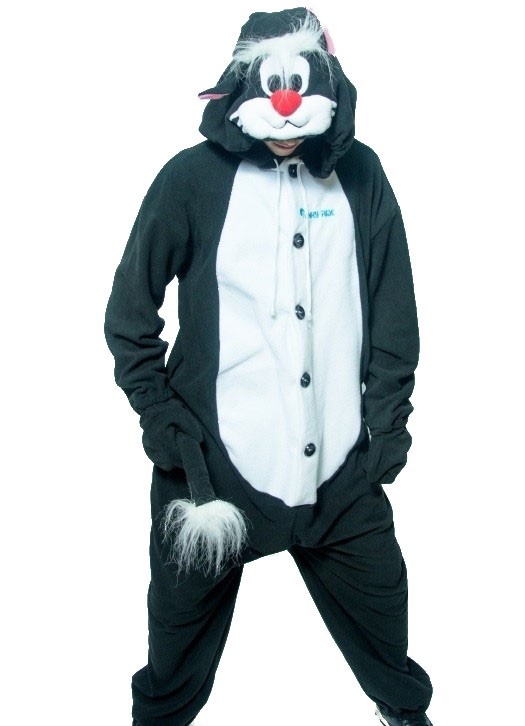 Кигуруми Кот Сильвестр выполнен из мягкого флисового мягкого материала серого цвета. Кигуруми на пуговицах и с двумя внутренними карманами. Капюшон выполнен в виде мордочки кота Сильвестра. Сзади пришит длинный хвост с белой опушкой. К рукавам крепятся съемные варежки.