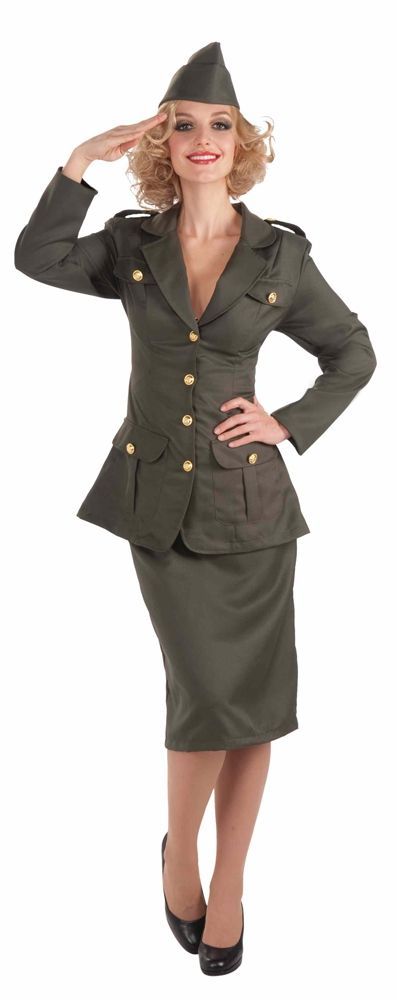 Костюм армейской леди выполнен в темно зеленом цвете. В комплект костюма входит юбка до колен, приталенный пиджак на золотых пуговицах и пилотку. Этот костюм придаст вам отважности и в то же время нежности.