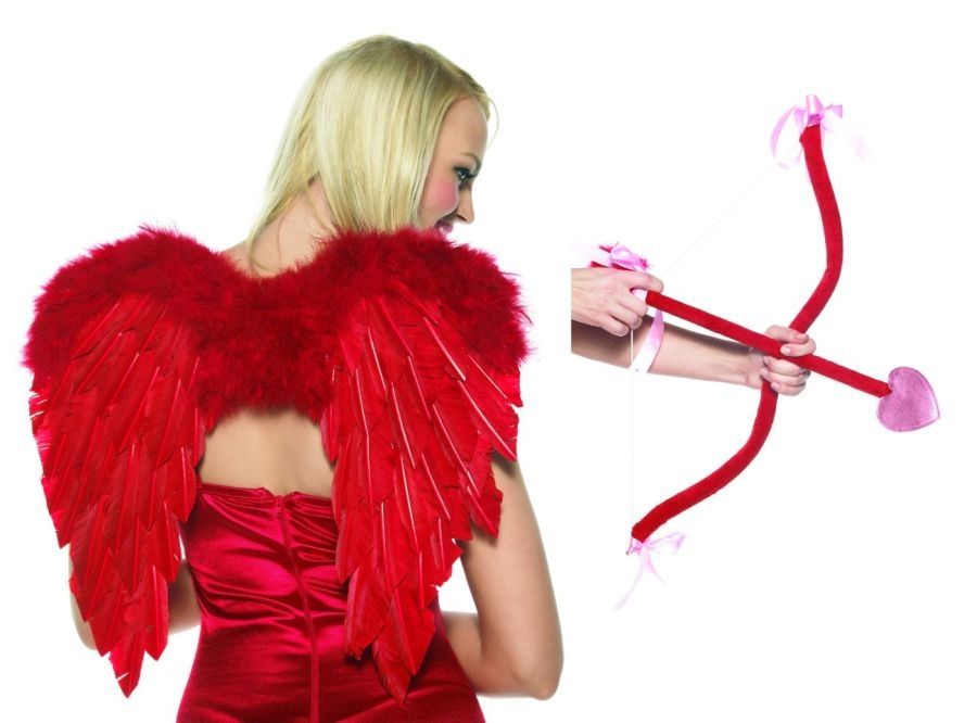 Комплект амура включает в себя красный лук, стрелу с плюшевым наконечником в виде сердца и красные крылья. Комплект подойдет для Дня влюбленных и других праздников.